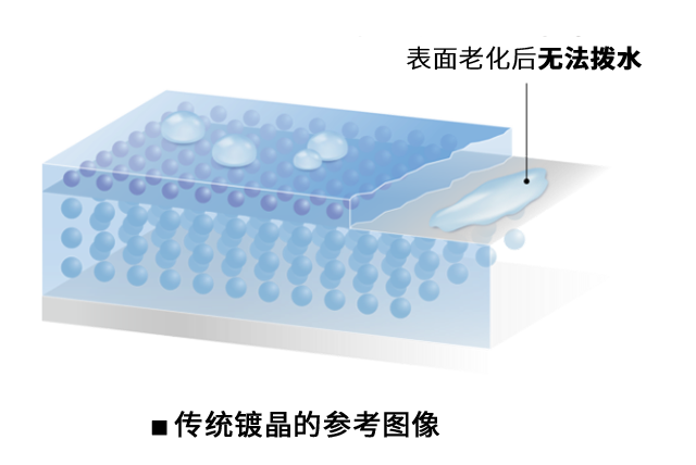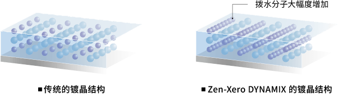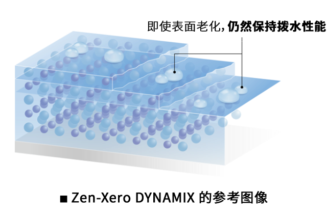 具有拨水性能的镀晶,其拨水基通常形成于表面,因此随着镀晶的逐渐减少,拨水性能容易丧失。Zen-Xero DYNAMIX采用与传统不同的方法,将液剂与玻璃相融合,使拨水成分均匀分布于镀晶内部。由此,即使涂层减少,拨水基仍然存在,从而实现持续的拨水效果。