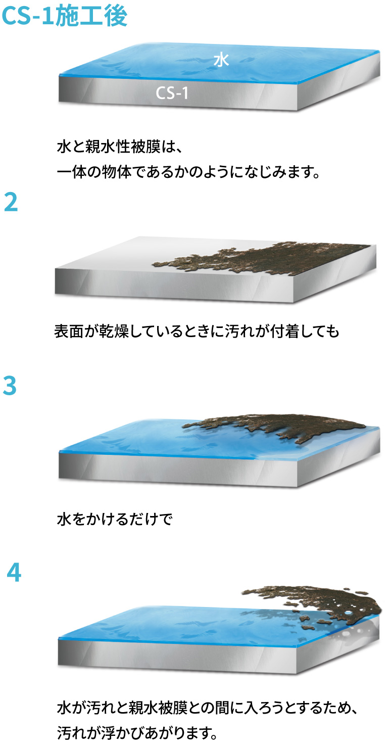 CS-1は、塗装面にとって最良の状態を得るために考え抜かれた弱親水性に耐油性を実現するのと同時に洗浄効果があります。形成された被膜の最表面が緻密で安定しているので、これが高い防汚性を実現することにつながっています。重ね塗りが可能で塗りを繰り返すことで一層光沢が増します。ムラなく均一に施工でき、ひび割れやはがれの発生はありません。